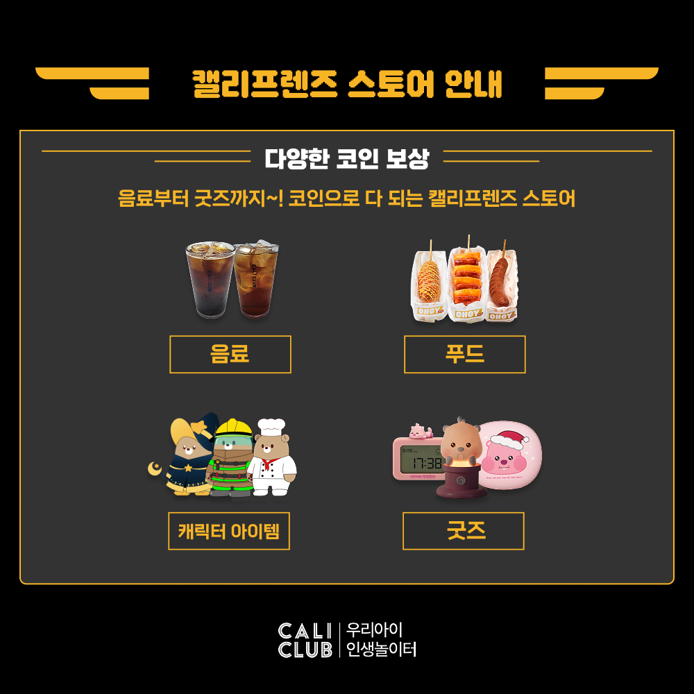모은 코인은 스토어에서 음료, 푸드, 굿즈, 캐릭터 아이템 등으로 교환할 수 있습니다.